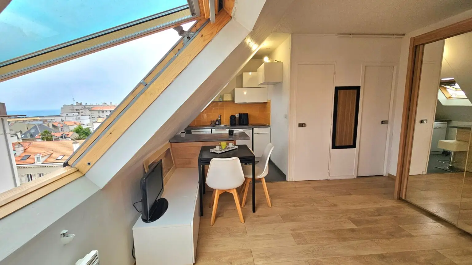 En plein centre-ville mais au calme, à quelques encablures de la Grande Plage et de l’hôtel du Palais, se niche ce charmant studio idéal pour passer un séjour à proximité immédiate des plages. Situé en dernier étage avec ascenseur, le vélux offre un bel aperçu mer.