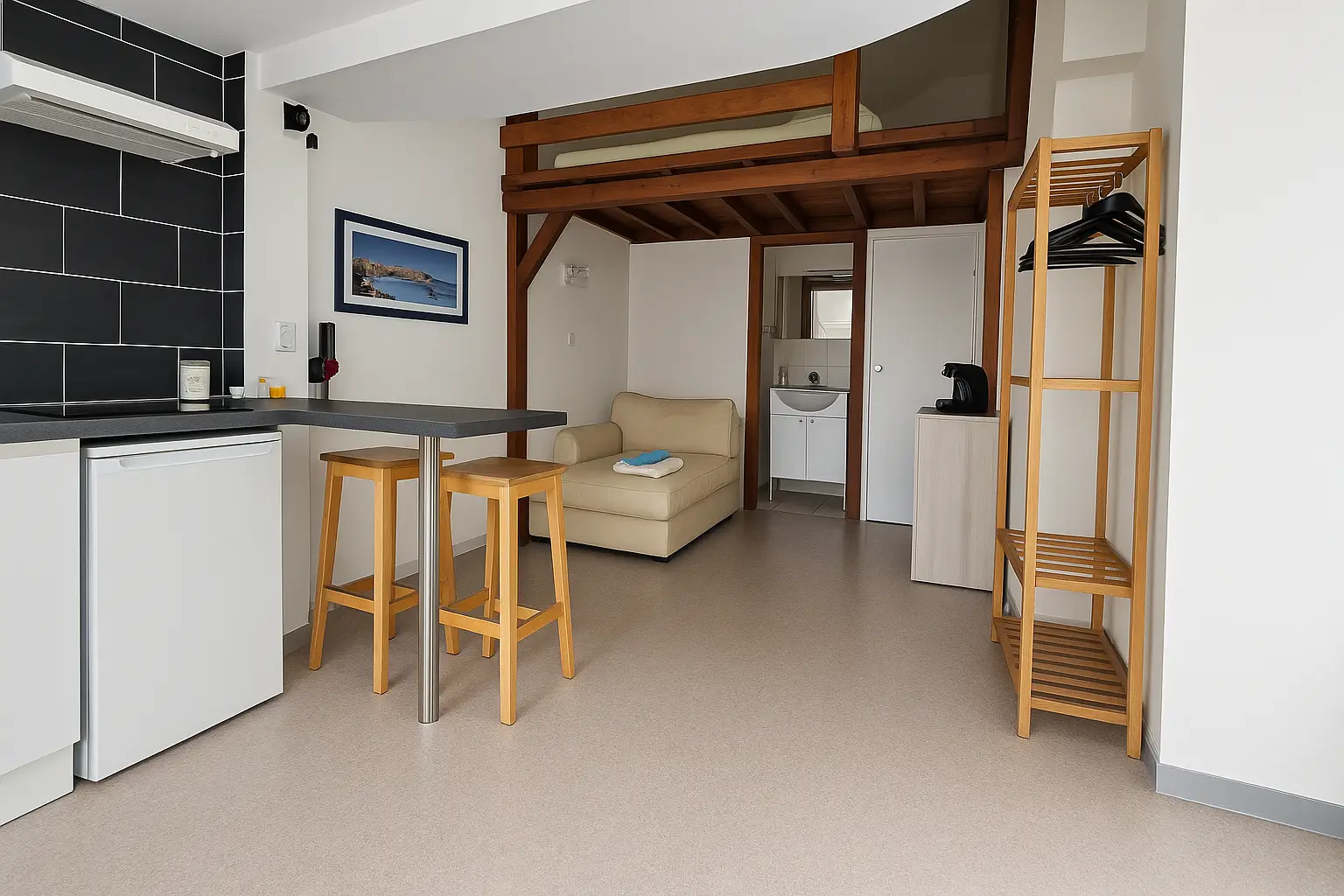À l’intérieur, vous trouverez des équipements modernes : une connexion wifi, une salle d’eau équipée d’un lavabo avec miroir, une douche à l’italienne, un WC suspendu, et une cuisine équipée comprenant un mini frigo, des plaques de cuisson à induction, et des ustensiles de cuisine.