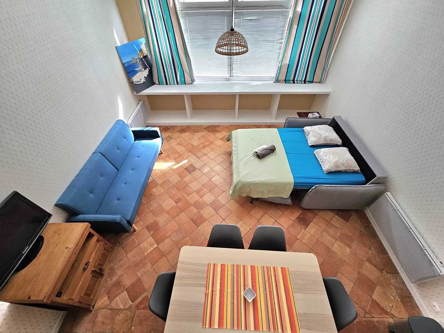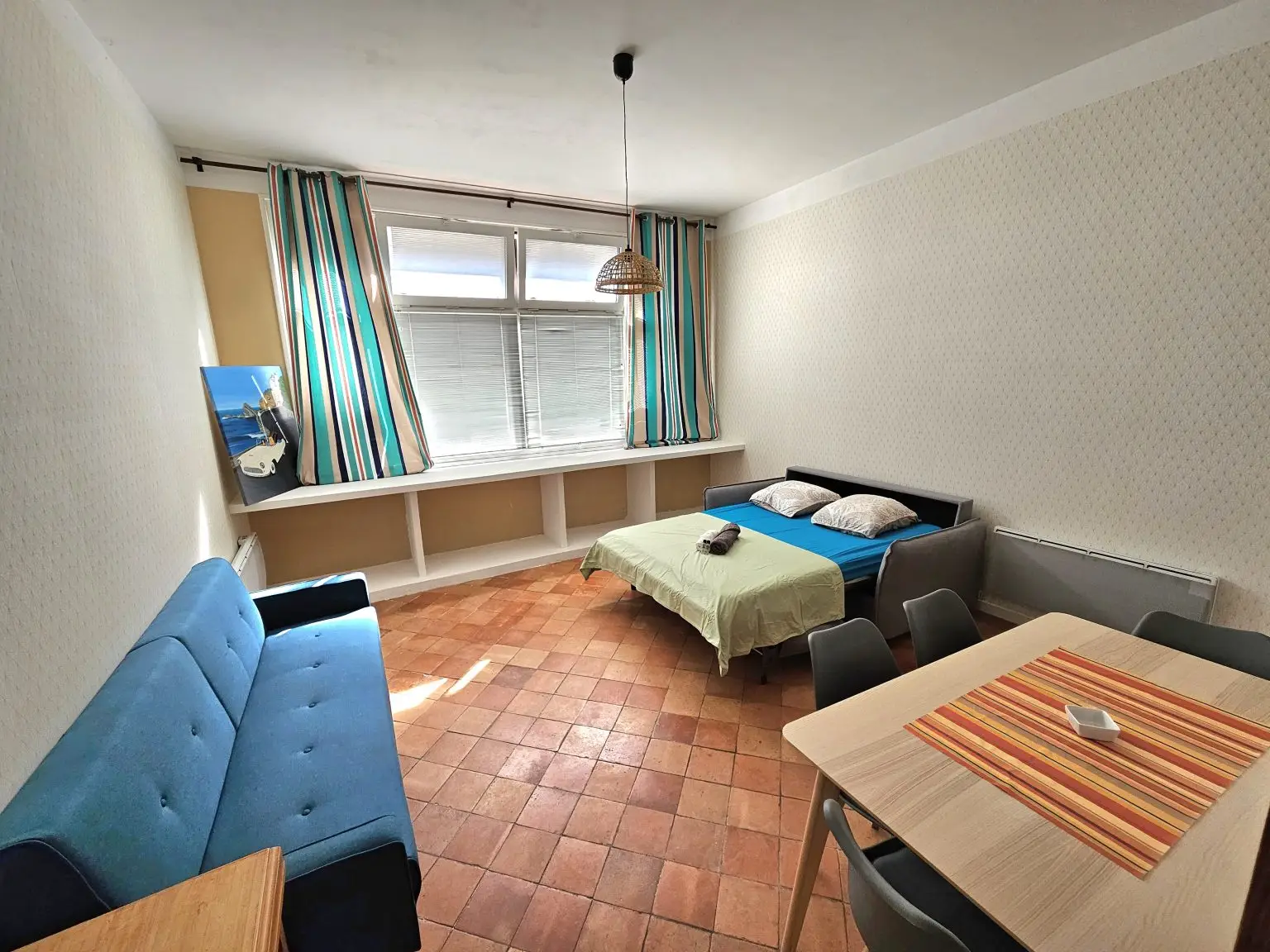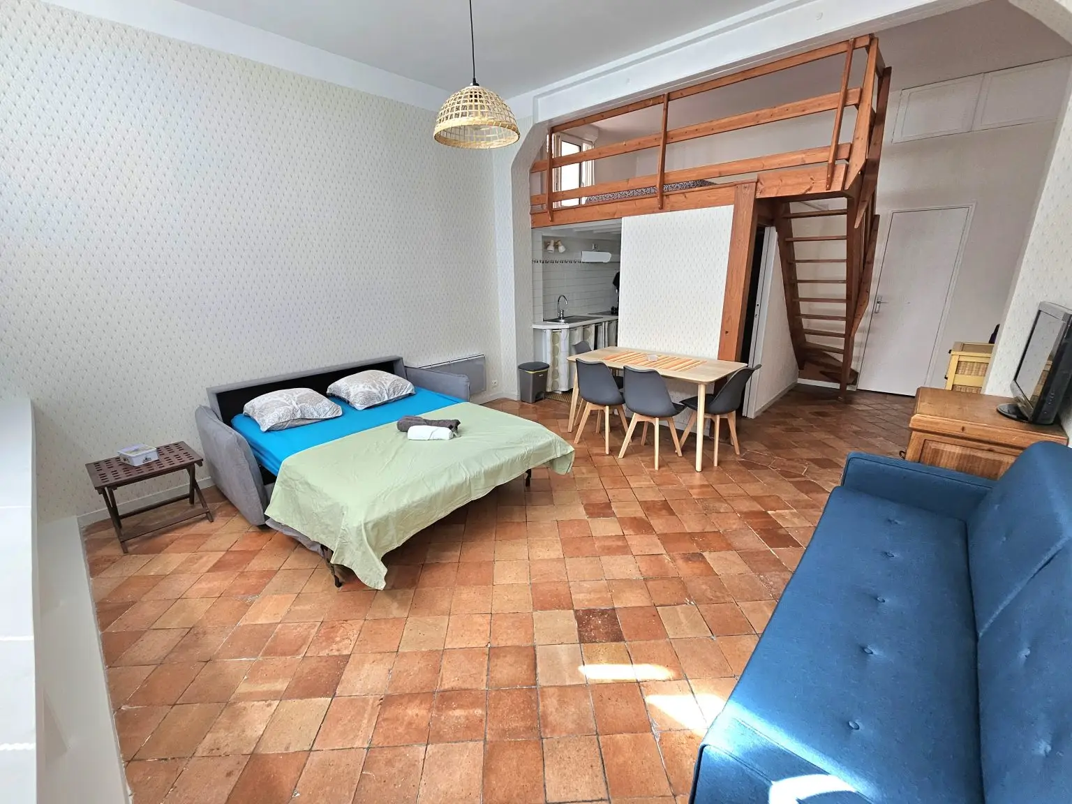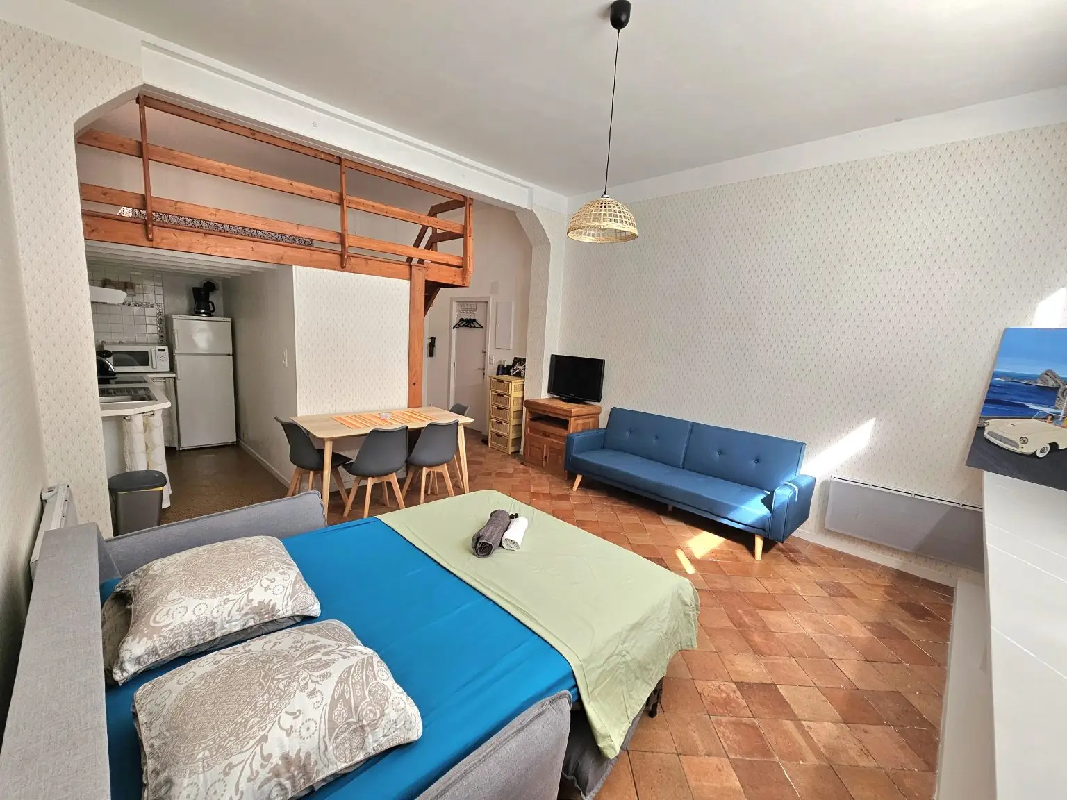 Ce vaste studio se situe à 15 min à pied du centre-ville de Biarritz et de la Grande Plage. Le canapé lit permet d’accueillir 2 personnes et la mezzanine complète la capacité de couchages avec un matelas pour de 2 personnes.