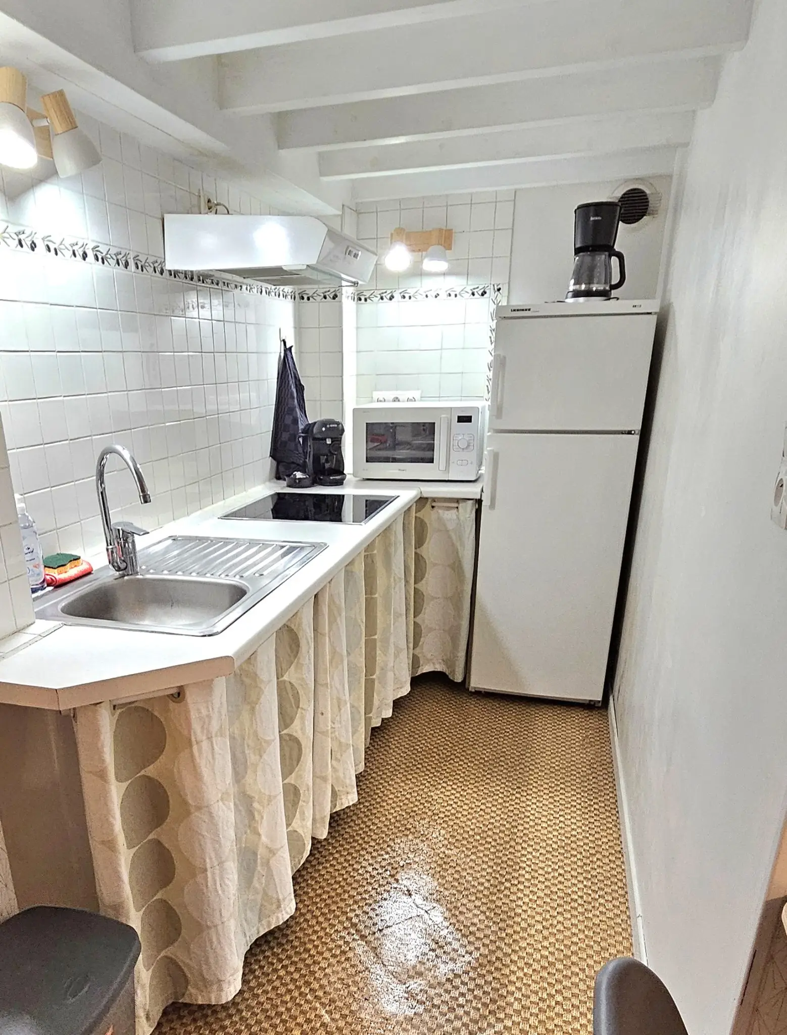 À l’intérieur, vous trouverez les équipements suivants : une salle d’eau équipée d’un lavabo avec miroir, une douche, une machine à laver, un WC séparé, une cuisine équipée comprenant un réfrigérateur, des plaques de cuisson, un micro-ondes et des ustensiles de cuisine.